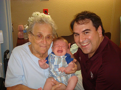 While we had the chance, we bravely went where parents of 6 week olds rarely go (and maybe shouldn't go), on a road trip. We decided to take advantage of the long weekend and the time before I go back to work to visit Javi's grandma in McAllen. While Christian used to fall asleep easily in his car seat, we learned that that is no longer the case. He and, thus, Javier and I had a long day, so for our visit with Great Abuela, Christian wasn't a happy camper. Like most Grandma's, she saw the positive in her great grandson and complemented his strong vocal cords.